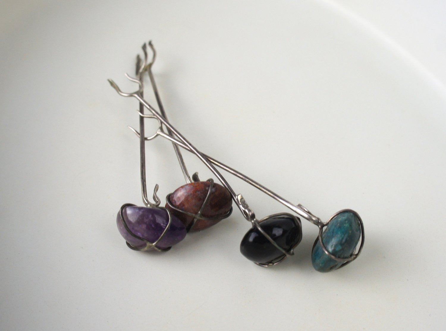 Description: This is an adorable set of martini skewers or picks, each decorated with a polished, smooth stone. The picks each have a little hook at the top to secure them to the edge of a martini glass and are double pronged at the bottom to hold olives, fruit, or other cocktail garnishes.
