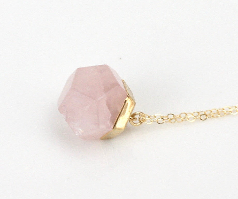 Faceted Dodecahedron Rose Quartz Pendant Long Gold Necklace