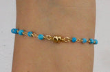 Description: This is a simple bracelet with a faceted round moonstone at the center in a gold bezel setting with a chain beaded with tiny turquoise beads. This bracelet is very easy to put on and remove, as it has a magnetic clasp. The moonstone is held in a bezel setting and appears clear with white clouds and iridescent color in the light.